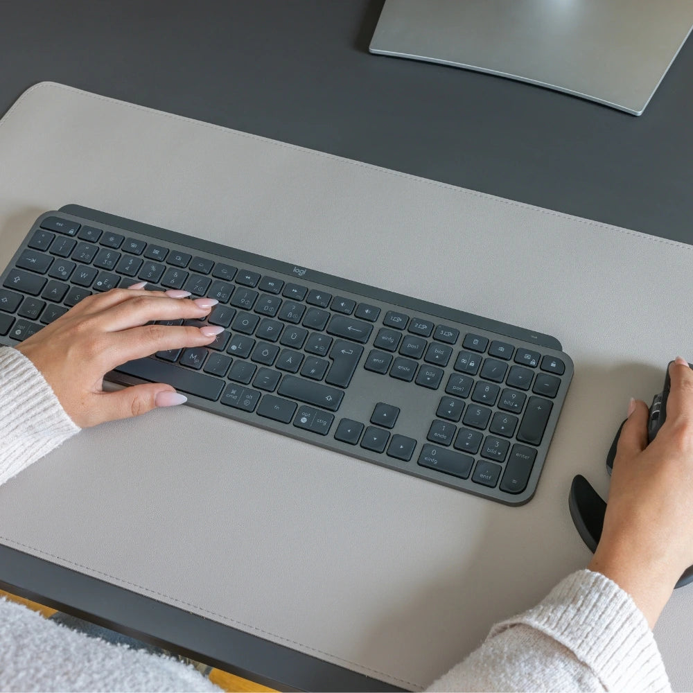 Nahaufnahme einer Person, die auf einer MATDESK Schreibtischunterlage eine Tastatur und Maus benutzt. Die Unterlage bietet eine glatte, angenehme Oberfläche für komfortables Arbeiten und ist rutschfest, ideal für den täglichen Gebrauch im Büro oder Homeoffice.