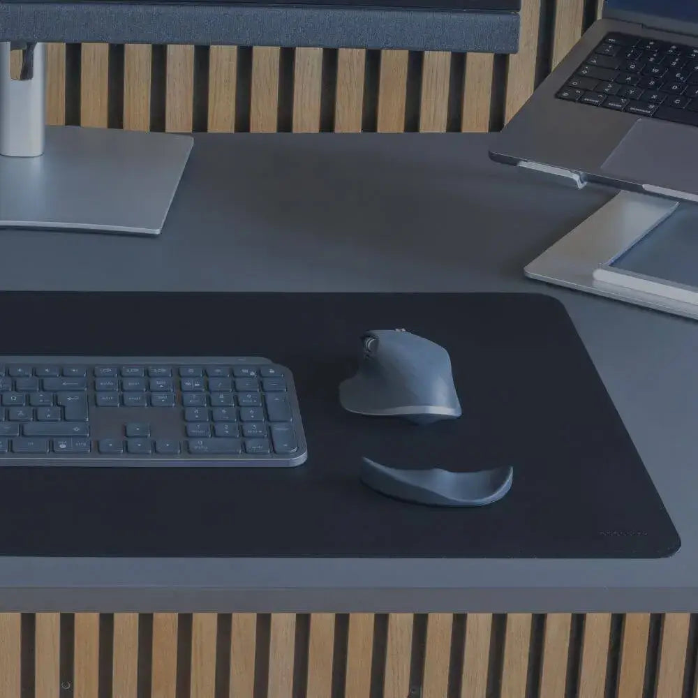 Dunkelblaue MATDESK Schreibtischunterlage aus Premium-Kunstleder mit einer Tastatur und Maus darauf platziert. Die elegante, rutschfeste Unterlage bietet eine hochwertige und komfortable Arbeitsfläche.Nahaufnahme einer Person, die auf einer MATDESK Schreibtischunterlage eine Tastatur und Maus benutzt. Die Unterlage bietet eine glatte, angenehme Oberfläche für komfortables Arbeiten und ist rutschfest, ideal für den täglichen Gebrauch im Büro oder Homeoffice.